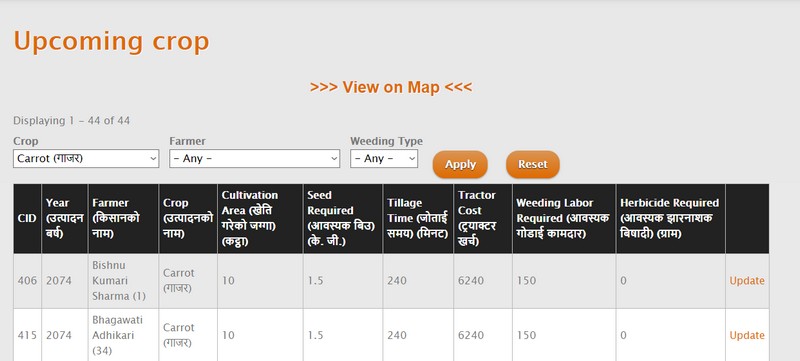 This dashboard is to monitor what crop is going to be cultivated next. You can find out the optimum seed required, tillage time, tractor cost, weeding labor required, herbicide or chemical required for the upcoming crop in your area of cultivation. You can see the total seed required for the cooperatives members. You can make a comparative analysis between weeding labor cost and herbicide use cost. The prior requirement and information can be viewed on GIS map.